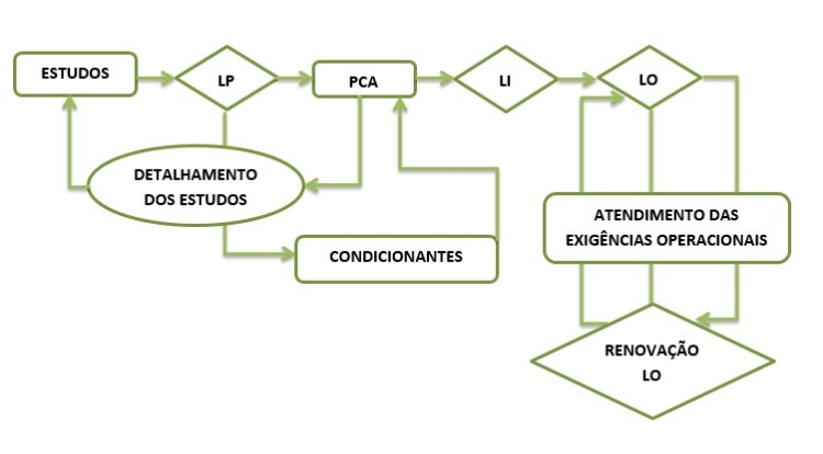 As licenças são divididas em três fases, sendo elas, licença previa, licença de instalação e licença de operação.